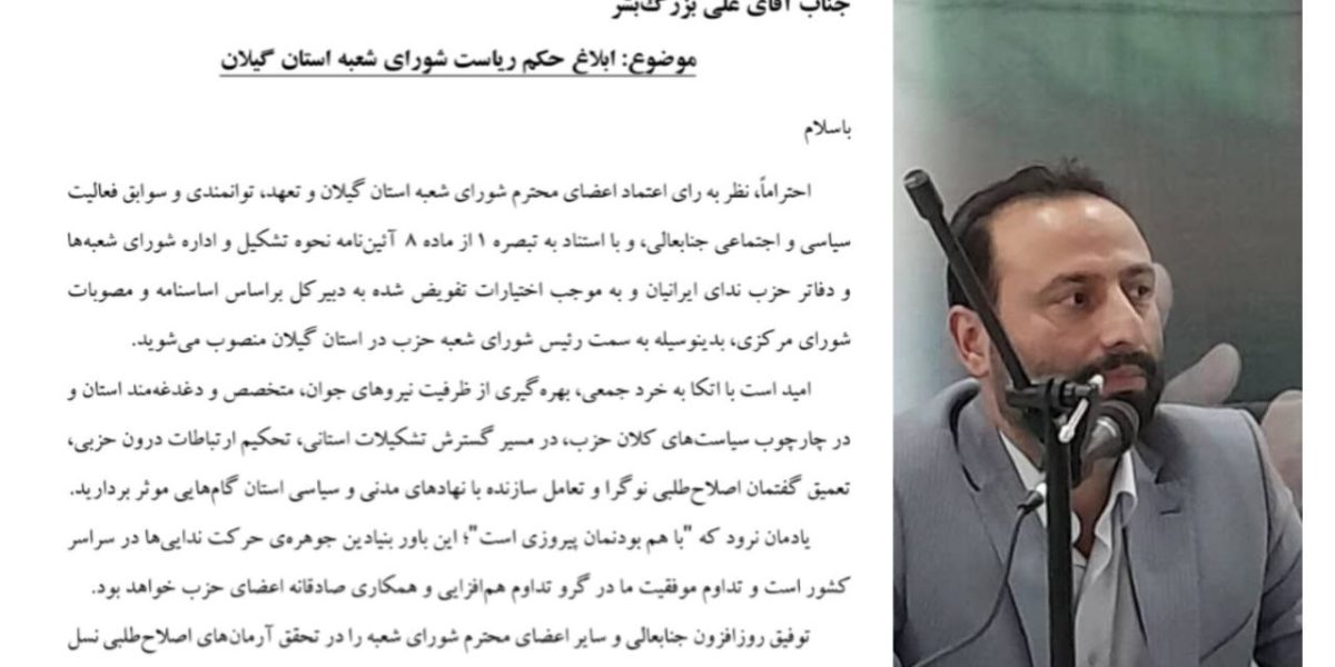علی بزرگ‌بشر به ریاست شورای شعبه حزب ندای ایرانیان استان گیلان منصوب شد
